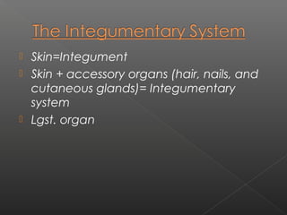 The integumentary system consists of the skin and its accessory structures like hair, nails, and glands. The skin is composed of three layers - the epidermis, dermis, and hypodermis. The epidermis is made of stratified squamous epithelium and contains keratinocytes that produce keratin, as well as melanocytes, Langerhans cells, and Merkel cells. The dermis is made of dense connective tissue and contains sensory receptors, hair follicles, and glands. The hypodermis is made of adipose tissue. The skin and its structures act as a barrier, regulate temperature, contain sensory receptors, synthesize vitamin D, and aid in excretion.