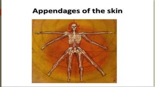 The skin consists of three layers - the epidermis, dermis, and subcutaneous tissue. The epidermis provides protection and contains melanocytes, Langerhans cells, and Merkel cells. The dermis contains tough connective tissue, hair follicles, and sweat glands. Sweat glands help regulate body temperature and excrete waste. Skin also contains sebaceous glands associated with hair follicles and nails composed of keratinized epithelial cells.