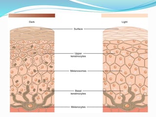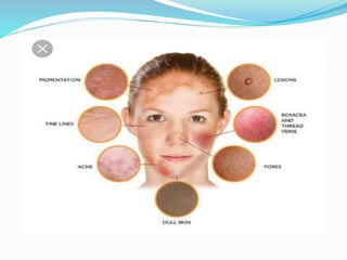 The document discusses the structure and function of the skin. It describes the three main layers of the skin - the epidermis, dermis, and hypodermis. The epidermis is made of epithelial cells and protects the body. The dermis contains connective tissue, hair follicles, and sweat and sebaceous glands. The hypodermis contains fat and cushions internal organs. It also discusses common skin conditions like acne, eczema, seborrheic dermatitis, and skin cancers.