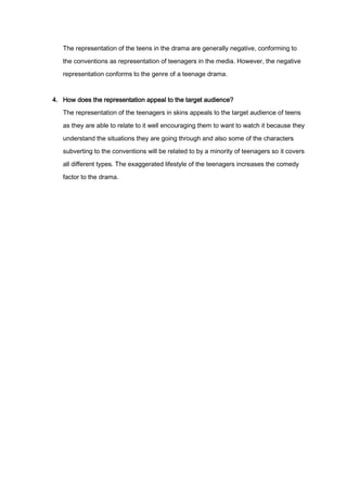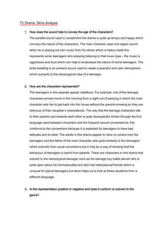 The sound design in the TV drama Skins helps convey the age of the characters. Aggressive heavy metal music represents some teenagers, while ambient bird sounds create a calm atmosphere. The characters are generally rebellious and disrespectful, partying and using foul language. However, some characters subvert stereotypes, like the openly gay teenage ballet dancer. While most representations are negative, conforming to genre conventions, this negative portrayal also appeals to the target teenage audience as they can relate to the situations.
