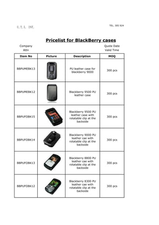 This document is a pricelist from Ibrahim Santos of U.T.I. Int. for various BlackBerry cases. It lists over 60 items, each with a product code, picture, description, minimum order quantity, quote date, lead time, and price in US dollars. The majority of items are PU leather, silicone, or plastic cases for different BlackBerry models, ranging in price from $1.65 to $8.20. Lead times are typically 7-12 days or 14-21 days.