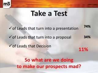 This document discusses strategies for turning leads into sales. It provides data showing that 74% of leads result in a presentation, 34% in a proposal, and 11% in a decision. It identifies the top factors for converting leads to revenue as quality of marketing, understanding customer needs, listening skills, value to price fit, and fit. It outlines steps for determining a customer's motivation or "energy for change" and using tools like the value star and solution boxes to address customer pains and motivations toward a solution. It stresses qualifying leads by assessing urgency, impact, and resources and setting "I-dates" for when a customer will commit to a decision. The overall message is that proactive selling requires understanding customer needs and motiv