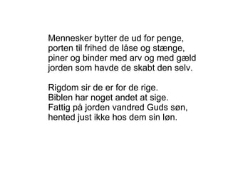 Mennesker bytter deud for penge, porten til frihed de låse og stænge, piner og binder med arv og med gæld jorden som havde de skabt den selv. Rigdom sir de er for de rige. Biblen har noget andet at sige. Fattig på jorden vandred Guds søn, hented just ikke hos dem sin løn.