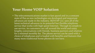 Skivoip LLC offers a flexible VoIP telephone service that utilizes high-speed internet, allowing customers to make international calls at minimal monthly fees. The service works with various phones, including existing home phones via an adapter, and provides features such as call forwarding, voicemail, and the ability to obtain a North American phone number. The company emphasizes innovation and customer satisfaction while adapting to trends in telecommunications.