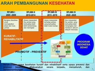 Dokumen ini membahas tentang upaya peningkatan akses dan kualitas pelayanan kesehatan di Indonesia melalui berbagai program RPJMN, termasuk survei kepuasan masyarakat. Tujuannya adalah untuk mendorong partisipasi masyarakat dalam menilai dan meningkatkan kualitas pelayanan publik. Selain itu, terdapat panduan pelaksanaan dan pengolahan data survei untuk mendapatkan penilaian objektif terhadap kinerja penyelenggara pelayanan.