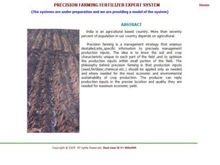 This document provides an overview of developing an expert system for effective agricultural extension services. It discusses the need for expert systems due to challenges in extension work like a low ratio of extension agents to farmers. The document defines expert systems and outlines their advantages like providing expert-level advice quickly. It compares conventional extension to expert systems and describes the components and applications of expert systems in agriculture. Case studies show expert systems can improve farmers' knowledge and increase crop yields and profits. The document concludes expert systems integrated with other technologies can help strengthen research and extension services.