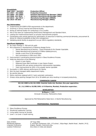 S K Navidullah has over 25 years of experience in production and quality management for pharmaceutical companies. He currently works as a Manufacturing Manager at GlaxoSmithKline Pharmaceuticals Ltd. in Nasik, India. He has extensive experience managing sterile injectable and tablet production lines. Navidullah is skilled in quality management systems, process improvements, and team leadership. He has received promotions and achieved productivity increases throughout his career.
