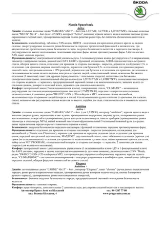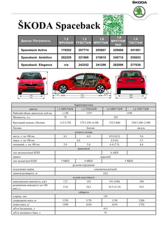 Документ описывает характеристики автомобиля Škoda Spaceback, включая различные двигатели, мощности, расход топлива, трансмиссии и размеры. Также представлена информация о комплектациях Active, Ambition и Elegance, включая дизайн, безопасность, функциональность и комфорт. В заключение указаны контактные данные автоцентра в Праге.