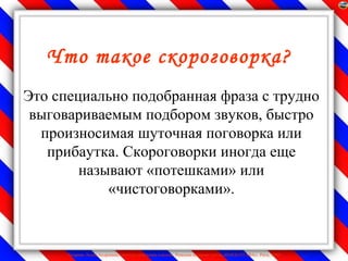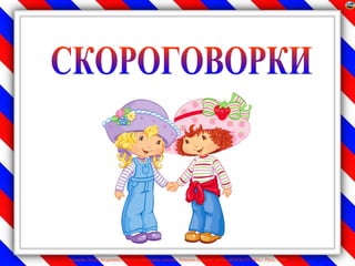 Документ посвящен скороговоркам, которые являются фразами с трудными для произношения звукосочетаниями, часто вызывающими смех и являющимися игрушечными поговорками. Приведены примеры известных скороговорок, которые знакомы многим с детства и помогают улучшить произношение. Автор, Лидия Андреевна Лазарева, делится своим опытом увлекательного обучения с использованием скороговорок.