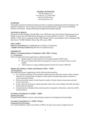 This document provides a summary of Stephen Kleimeyer's technical skills and experience in computer programming, web development, and database construction. He has over 15 years of experience in these fields, having worked on projects involving programming languages like Visual Basic, C++, C#, ASP.NET, PHP, and databases like SQL Server, MySQL, and Oracle. He holds a Master's Certificate in SharePoint and a BS in Computer Science.