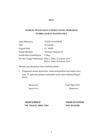 Penelitian ini bertujuan untuk meningkatkan hasil belajar siswa kelas IV SDN Harjasari 01 pada mata pelajaran matematika materi dasar lambang bilangan romawi melalui penggunaan alat peraga dan metode demonstrasi. Hasil belajar siswa masih rendah karena kurangnya pemahaman konsep dasar dan kurangnya penggunaan metode yang interaktif dalam proses pembelajaran.