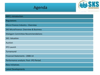 The document provides an overview of SKS Microfinance, including its business model, valuation process, and regulatory environment. SKS pioneered the joint liability group lending model and grew rapidly before facing difficulties in 2010. It valued itself using a branch-level valuation model that projected earnings and growth rates. Key recommendations from the Malegam Committee established regulations for the microfinance sector, including categorizing qualified NBFCs as NBFC-MFIs and capping interest rates.