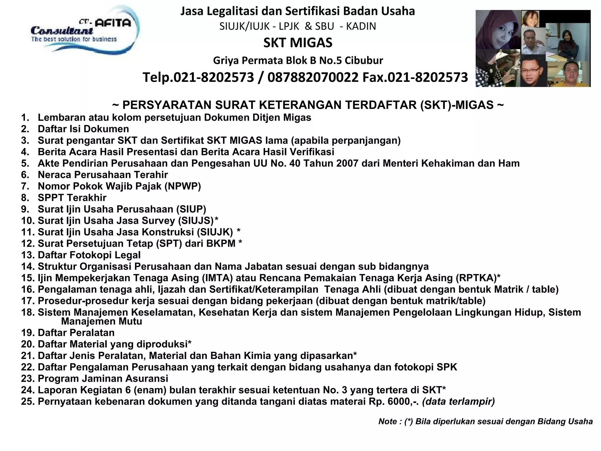 Dokumen tersebut memberikan persyaratan untuk memperoleh Surat Keterangan Terdaftar (SKT)-MIGAS yang meliputi 25 dokumen administrasi seperti akte pendirian perusahaan, NPWP, SIUP, struktur organisasi, sertifikat tenaga ahli, sistem manajemen, dan laporan kegiatan enam bulan terakhir.