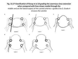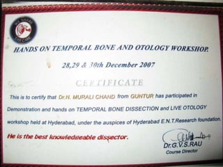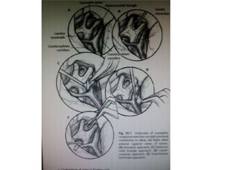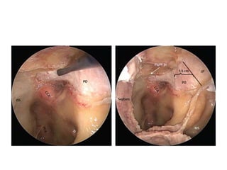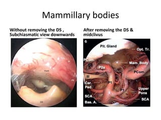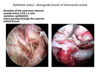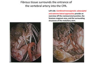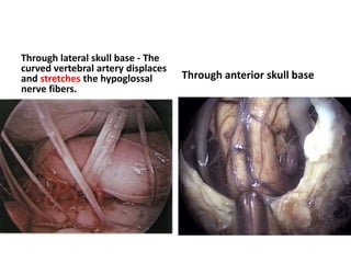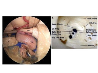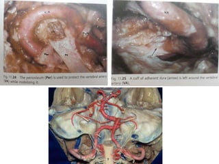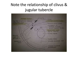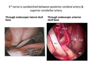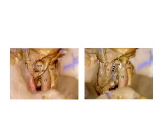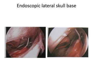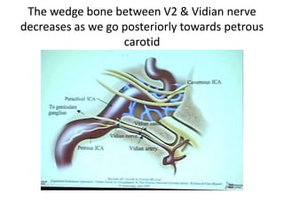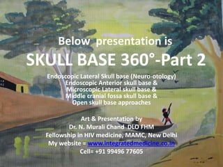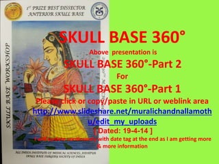 This document provides information on part 2 of a presentation titled "SKULL BASE 360°". It includes detailed descriptions of various parts of the skull base, including the orbit, cavernous sinus, internal carotid artery, petrous carotid artery, inferior petrosal sinus, jugular foramen, and cranial nerves 3 and 7. Links are provided for downloading additional presentations on the skull base from the website skullbase360.in. The presenter is Dr. N. Murali Chand who specializes in ENT.
