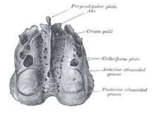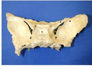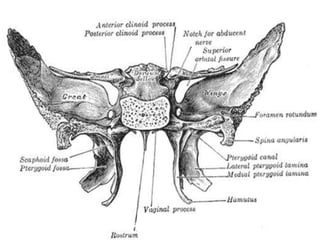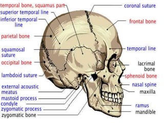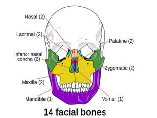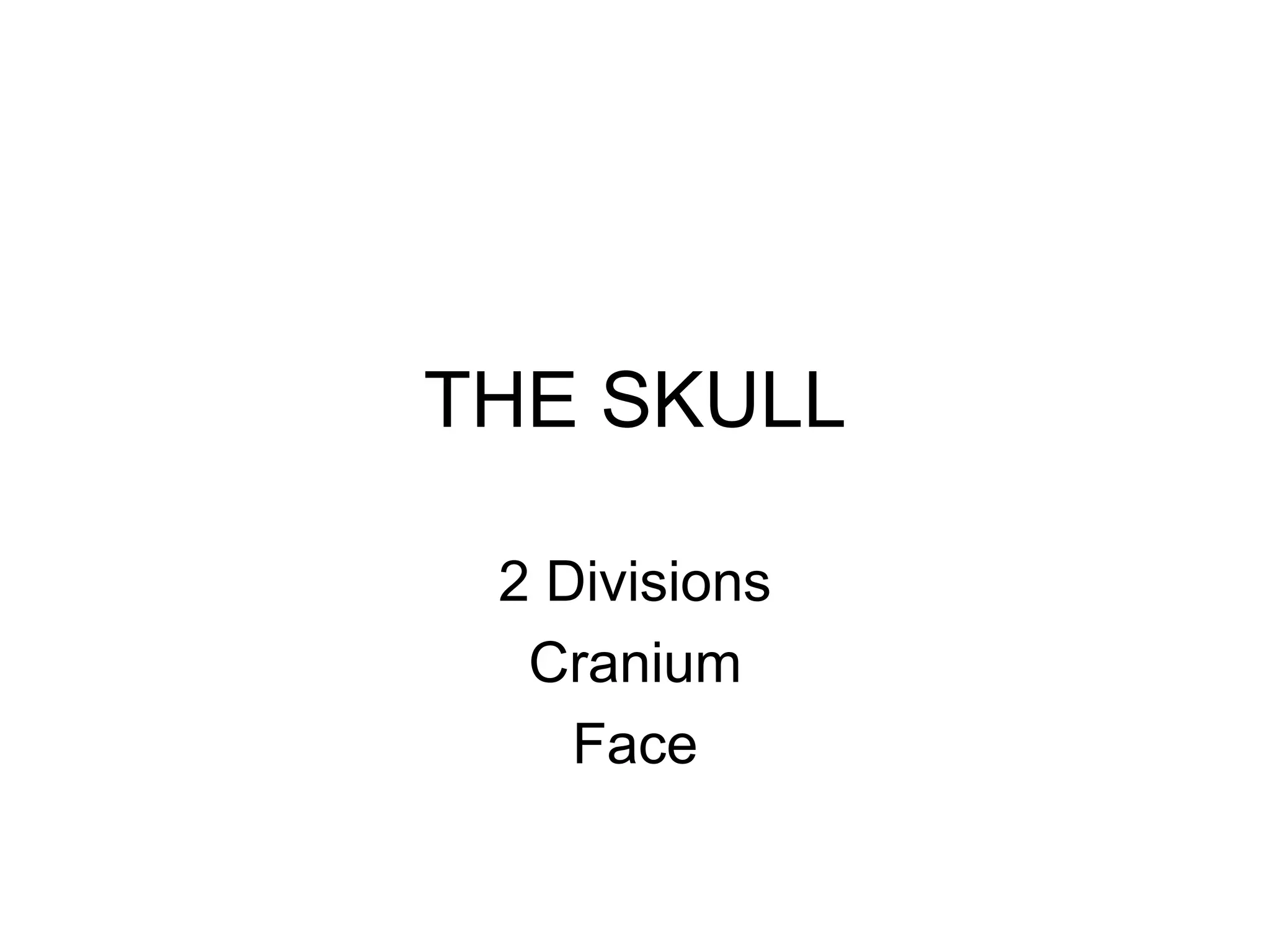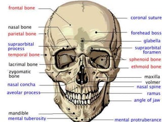 The skull is divided into two main divisions - the cranium and face. The cranium contains 8 bones that enclose and protect the brain, including the frontal, parietal, temporal, occipital, sphenoid, and ethmoid bones. The 14 facial bones form the framework of the face and contain openings for sensory organs, food/air passage, and secure the teeth. All skull bones are firmly joined together by sutures. The temporal bones form the sides of the skull and contain structures like the external ear. The sphenoid and ethmoid bones have complex shapes and articulate with many other bones. The maxillary bones make up the upper jaw.