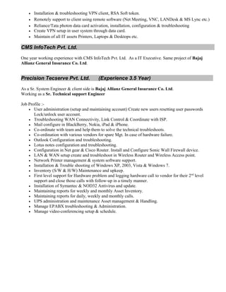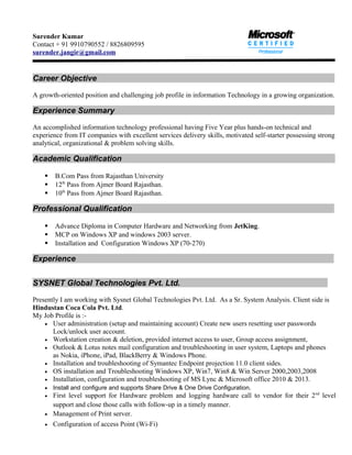 This document contains the resume of Surender Kumar. It outlines his contact information, career objective of seeking an IT position in a growing company, experience of over 5 years in IT companies, academic qualifications including a BCom degree, and professional qualifications including an advanced diploma in computer hardware and networking. It then details his work experience over the past 5 years in various roles including system analyst, IT executive, and desktop support engineer for companies like Sysnet Global Technologies, CMS InfoTech, and QH Talbros Automotive Components. His responsibilities included user administration, software installation, troubleshooting, network administration, and hardware maintenance.