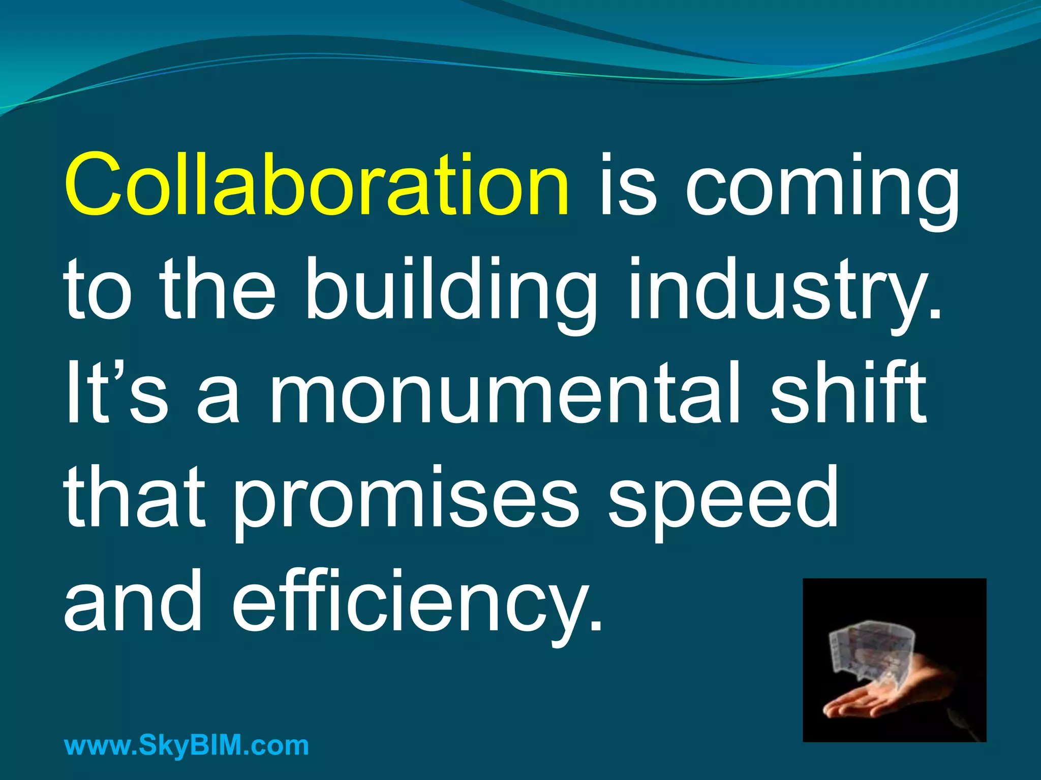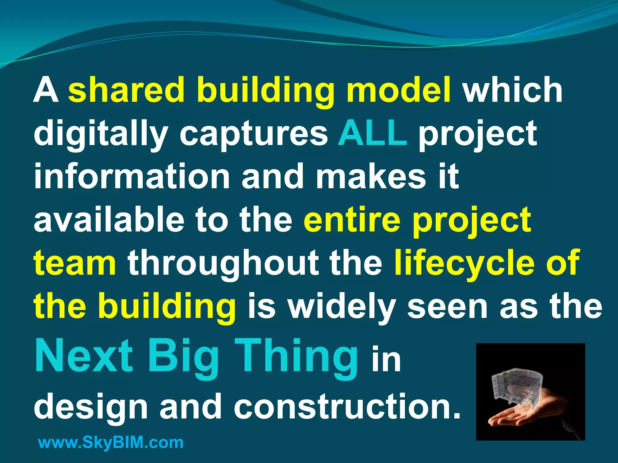 SkyBIM is a cloud-based platform designed to enhance collaboration and efficiency in the building industry by digitally capturing and sharing all project information throughout a building's lifecycle. It addresses issues of declining productivity and fragmentation in construction by providing a comprehensive model that integrates real-world data, cost estimates, and project documents. The platform enables seamless communication and coordination among project stakeholders, positioning it as a transformative tool for future design and construction projects.