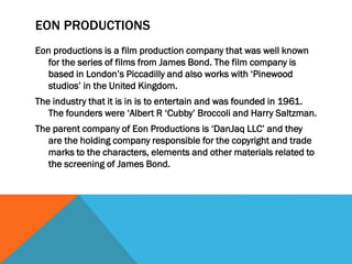 Eon Productions is a film production company based in London known for producing James Bond films. Founded in 1961 by Albert R. Broccoli and Harry Saltzman, Eon Productions works with Pinewood Studios in the UK. The parent company is DanJaq LLC, which holds the copyrights and trademarks related to James Bond characters and elements.