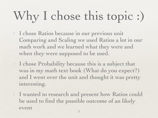 The document discusses ratios and probability. It defines ratios as relationships between two amounts and explains how ratios can be converted to fractions and percentages. It also defines probability as the possibility of an event occurring against other outcomes. The document then explains how ratios can be used to find probabilities, like the probability of rolling a six on a die is 1:6. It provides examples of using ratios to calculate probabilities in events like coin flips, card draws, and more. It also describes a classroom activity where students recorded dice rolls to understand ratio probabilities.