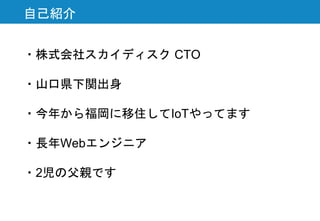 自己紹介 ・株式会社スカイディスク CTO ・山口県下関出身 ・今年から福岡に移住してIoTやってます ・長年Webエンジニア ・2児の父親です