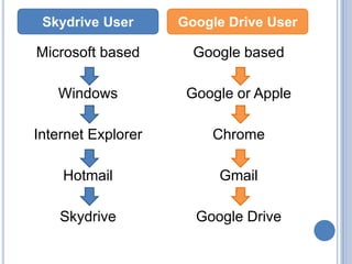 This document compares Google Drive and Skydrive for accessing and sharing documents through cloud storage. Both platforms offer around 5-7 GB of storage and allow users to create, upload, and access recent files. However, Skydrive is based on Microsoft products while Google Drive is based on Google products. Skydrive also allows sharing of entire folders and easy syncing between desktop and cloud storage by dragging documents to the Skydrive icon on the taskbar.