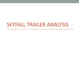 The trailer uses sound and visual techniques to quickly immerse viewers in the action and intrigue of the film. Diegetic drums at the start set an urgent tone and introduce uncertainty about Bond through a close-up of his eyes. Quick cuts between scenes maintain this pace. A voiceover from M establishes her as a powerful yet challenging of gender stereotypes. Bond is later shown fighting and being shot, contrasting his usual power through his helpless position in the water. The trailer builds climax through increasingly shorter shots, establishing characters, conflict, and intrigue to interest viewers in the film.
