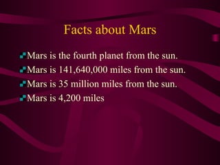 Mars is the fourth planet from the sun and is approximately 141 million miles from the sun. It is slightly larger than Earth but has lower gravity, with gravity about 37% of Earth's. The temperature on Mars ranges from -225 to 63 degrees Fahrenheit. Mars is red in color and has mountains, volcanoes, craters and dried-up river beds. It has a thin atmosphere composed mainly of carbon dioxide with some nitrogen and argon. Mars has two moons named Phobos and Deimos and has been explored by numerous space missions, including the Mars Odyssey. While there is evidence of ancient water on Mars, life does not exist there currently likely due to the lack of liquid water.