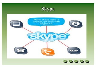 คือ โปรแกรมทีทําให ้เราพูดคุยกับเพือนทัว โลกได ้ฟรีผานคอมพิวเตอร์ทต่อระบบเครือข่าย ่ ี ี อินเทอร์เน็ ต ทังเสยงและภาพ (Webcam)จาก เครืองหนึงไปยังอีกเครืองหนึง นอกจากนีเรายัง ้ สามารถใชโปรแกรม Skype โทรออกไปยัง ั ั โทรศพท์พนฐานหรือโทรศพท์มอถือในอัตรา ื ื ค่าบริการทีถูกกว่าปกติอกด ้วย ี