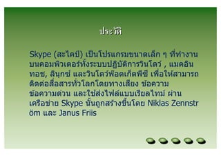 เป็ นโปรแกรมขนาดเล็ก ๆ ทีทํางาน บนคอมพิวเตอร์ทังระบบปฏิบัตการวินโดว์ , แมคอิน ิ ทอช, ลินุกซ ์ และวินโดว์พ๊อตเก็ตพีซ ี เพือให ้สามารถ ื ี ติดต่อสอสารทัวโลกโดยทางเสยง ข ้อความ ้ ่ ข ้อความด่วน และใชสงไฟล์แบบเรียลไทม์ ผ่าน เครือข่าย Skype นันถูกสร ้างขึนโดย Niklas Zennstr öm และ Janus Friis