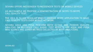 This document discusses using Sevana tools to test call quality between mobile devices using Skype. Specifically, it proposes a demonstration of a Skype-to-Skype call quality test using regular Android Skype apps on mobile phones. The test would record call audio and analyze it using Sevana's AQUA and PVQA tools to generate MOS scores and other quality metrics. It outlines the typical test setup and flow, including host machine, mobile phone, cable adapter, and test management via a backend server.