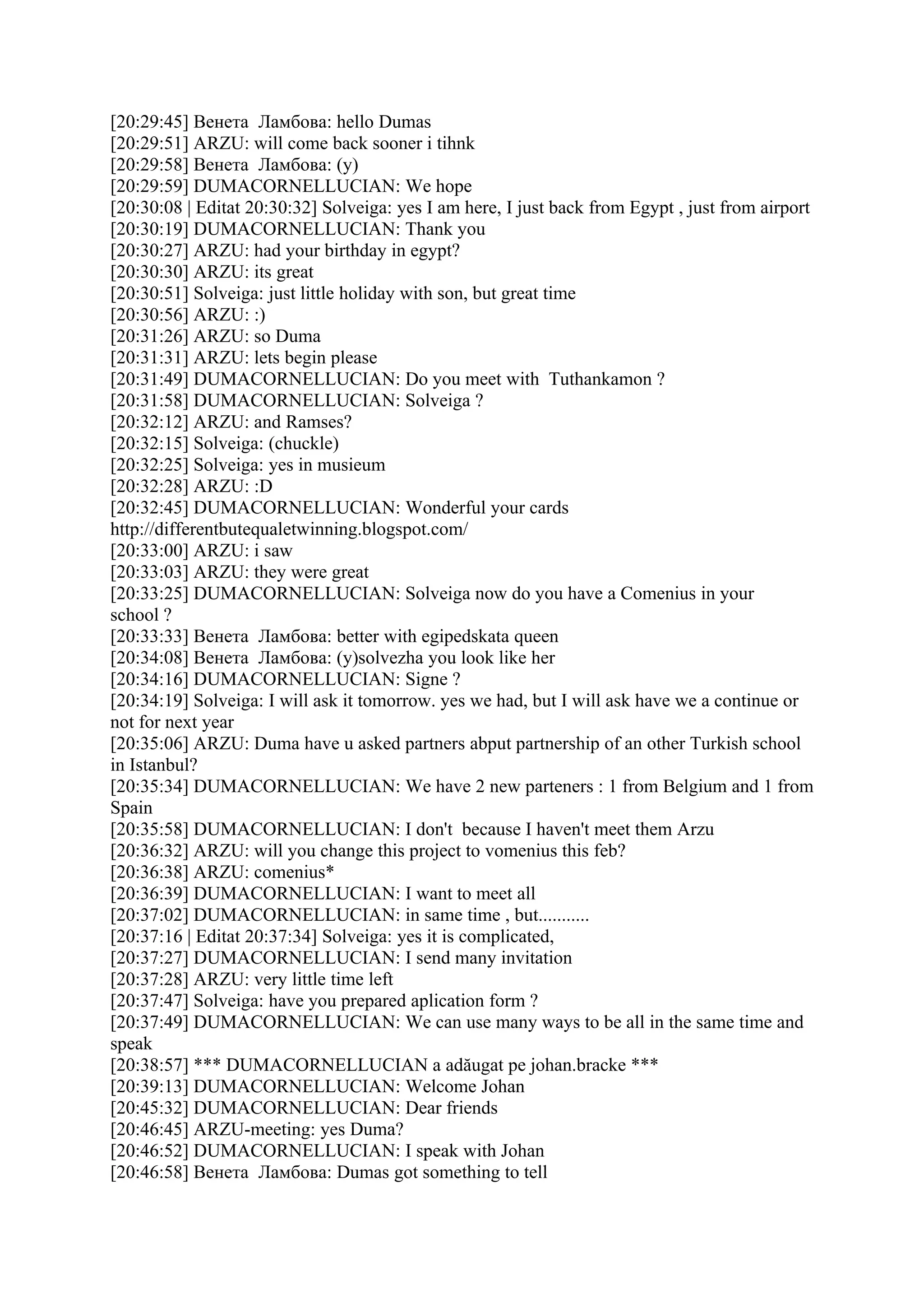 The document appears to be a transcript of an online chat between several individuals coordinating an upcoming meeting. They discuss logistics like dates and times. They also briefly introduce two new partners from Belgium and Spain who will be joining. They agree to meet again on Sunday at 7pm to continue planning.