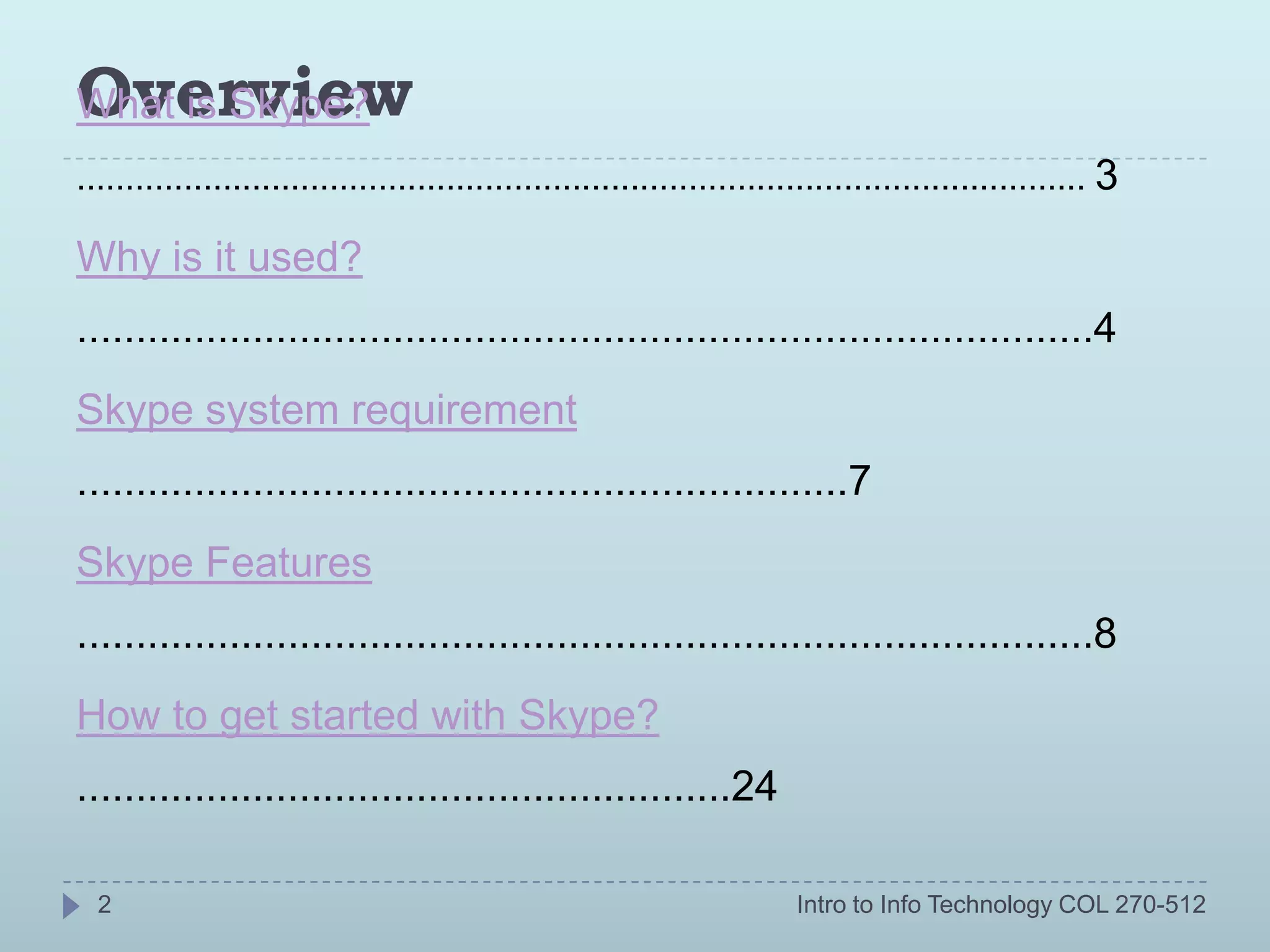 Skype is a free software program that allows users to make voice and video calls over the internet. It can be used to keep in touch with friends and family or for educational purposes from any location with an internet connection, such as homes, schools, or workplaces. Skype has features like video calling, file sharing, instant messaging, and voice mail. To use Skype, users download the software, create an account, add contacts, and can then make calls, share files, and message others on Skype for free or at low rates.