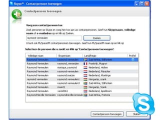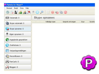 Waarom Skype enPamela?SkypeSimpelVoor iedereen toegankelijkLage kosten (gratis)(Beltegoed van € 10,-)Pamela ProfessionalKosten € 20,- (meerdere computers)Opnamen audio en video
