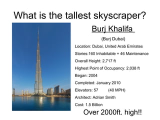 The tallest skyscraper in the world is the Burj Khalifa located in Dubai, United Arab Emirates. It stands 2,717 feet tall with 160 inhabitable stories and took over 6 years to construct from 2004 to 2010. Skyscrapers require strong foundations built on bedrock to support their massive weight. Their frames are constructed from steel columns and girders, with curtain walls on the exterior. To further spread the weight and stabilize tall buildings, skyscrapers are given spread footings and tuned mass dampers minimize swaying in the wind. During earthquakes, flexibility and damping systems help skyscrapers absorb shocks to avoid damage compared to more rigid designs.