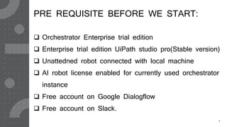 The document provides a comprehensive guide on creating a Slack chatbot using UiPath AI Fabric, outlining necessary prerequisites and step-by-step instructions. Key steps include deploying language translation models, creating a workflow in UiPath Studio Pro, establishing connections with Google Dialogflow and Slack, and testing the chatbot. Additionally, video links for each step are included for further assistance.
