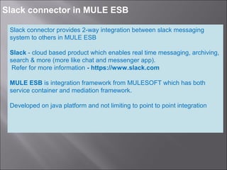 The document discusses using the Slack connector in Mule ESB to integrate Slack with other systems. It provides instructions on installing the Slack connector, configuring it with an API token, and using it to retrieve messages from Slack channels and display them in a logger component.