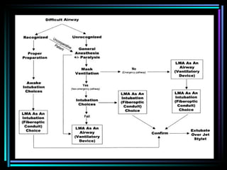 The document discusses various airway management devices and techniques used in basic life support. It describes oropharyngeal airways, nasopharyngeal airways, laryngeal mask airways, endotracheal tubes, and difficult airway management devices like the Combitube. Guidelines for sizing and inserting these devices are provided, along with their indications, contraindications, and potential complications. Factors that can make intubation difficult are also outlined.