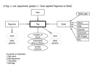 Tagboxes define interpretations of tag data and are responsible for processing tags to update one or more columns in a database table. A tagbox's run() method is given all relevant tags for a globj. It provides an API for creating tags and globjids. A sample tagbox calculates the mean tag ID for a project by summing all tag IDs and dividing by the number of tags.