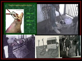 The document discusses various methods of animal slaughter, differentiating between 'slaughter' for food and 'killing' as an unethical act. It outlines humane slaughter practices, religious methods, and different stunning techniques including mechanical, chemical, and electrical methods, emphasizing the importance of minimizing animal distress. Additionally, it details regulations from the Humane Slaughter Act in the USA and the specific procedures for ritual slaughters such as Jhatka and Shechita.