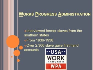 The document summarizes interviews conducted by the Works Progress Administration between 1936-1938 with over 2,300 former slaves from southern states. It provides excerpts from several interviews, including Charity Anderson who said she had a happy life before the Civil War and her kind master trusted her. Tempe Herndon Durham, who was 103 years old during her interview, discussed slave wedding and childbearing traditions. The interviews also described slave labor, relationships with owners, and past times.
