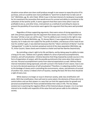 Proponents of slavery argued it was necessary for economic development and that slaves were better off and cared for. Opponents argued slavery was criminal and unjust, depriving slaves of basic human rights and liberties like freedom, family connections, and self-determination. While slavery supported some economies, alternatives were possible and slavery inherently robbed individuals of personal achievement, initiative, and dignity.
