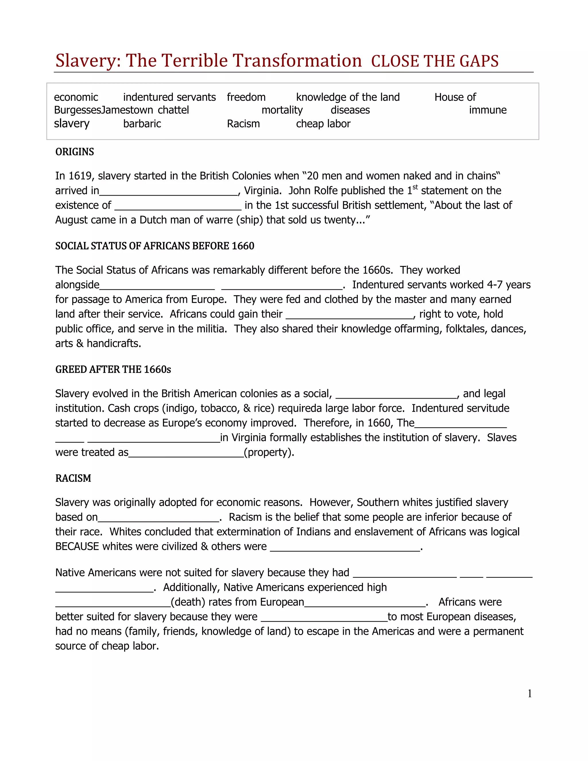 Slavery began in the British colonies in 1619 when 20 Africans arrived in Jamestown, Virginia. Originally, Africans had similar social status as indentured servants and could gain freedom. However, by the 1660s slavery evolved as a social and economic institution to meet the labor demands of cash crops. Africans were captured in Africa and subjected to the horrific Middle Passage to the Americas, where they were branded and shackled in cramped spaces, resulting in many deaths. Slavery was justified through racism and Africans were deemed better suited than Native Americans for the permanent, cheap labor of plantations. The triangular trade route profited immensely from this exploitation.