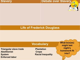 The document provides instructions for a class activity on the topics of slavery and abolition. Students are asked to take out an article on the slave trade from the previous day and write two ideas from it on the "Slavery" section of a historical context anchor chart. They will then view an excerpt from a PBS episode on abolition and answer additional text-dependent questions. Finally, students are assigned homework to add three more ideas to the "Debate over Slavery" section of the anchor chart.