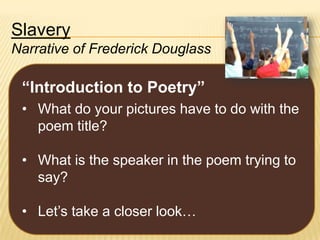 The document provides instructions for students to analyze the poem "Introduction to Poetry". It asks students to sketch three images inspired by the poem's title. It then prompts students to consider what the speaker is trying to say in the poem and to take a closer look at it. The poem is then presented, along with learning objectives about identifying poetic devices and finding layers of meaning in poems.