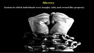 Slavery has existed in various forms for thousands of years. It began in Africa before European colonization and spread globally as the Portuguese, Spanish, English, French and others engaged in the transatlantic slave trade between the 15th and 19th centuries. Millions of people were taken from Africa and enslaved in the Americas. Slavery was gradually abolished in the late 18th and 19th centuries, starting with declarations in Vermont in 1777 and Britain banning the slave trade in 1807, but it continued in other forms into the early 20th century in some places. Slavery stripped people of rights and freedoms and legally classified them as property without kinship or protections.
