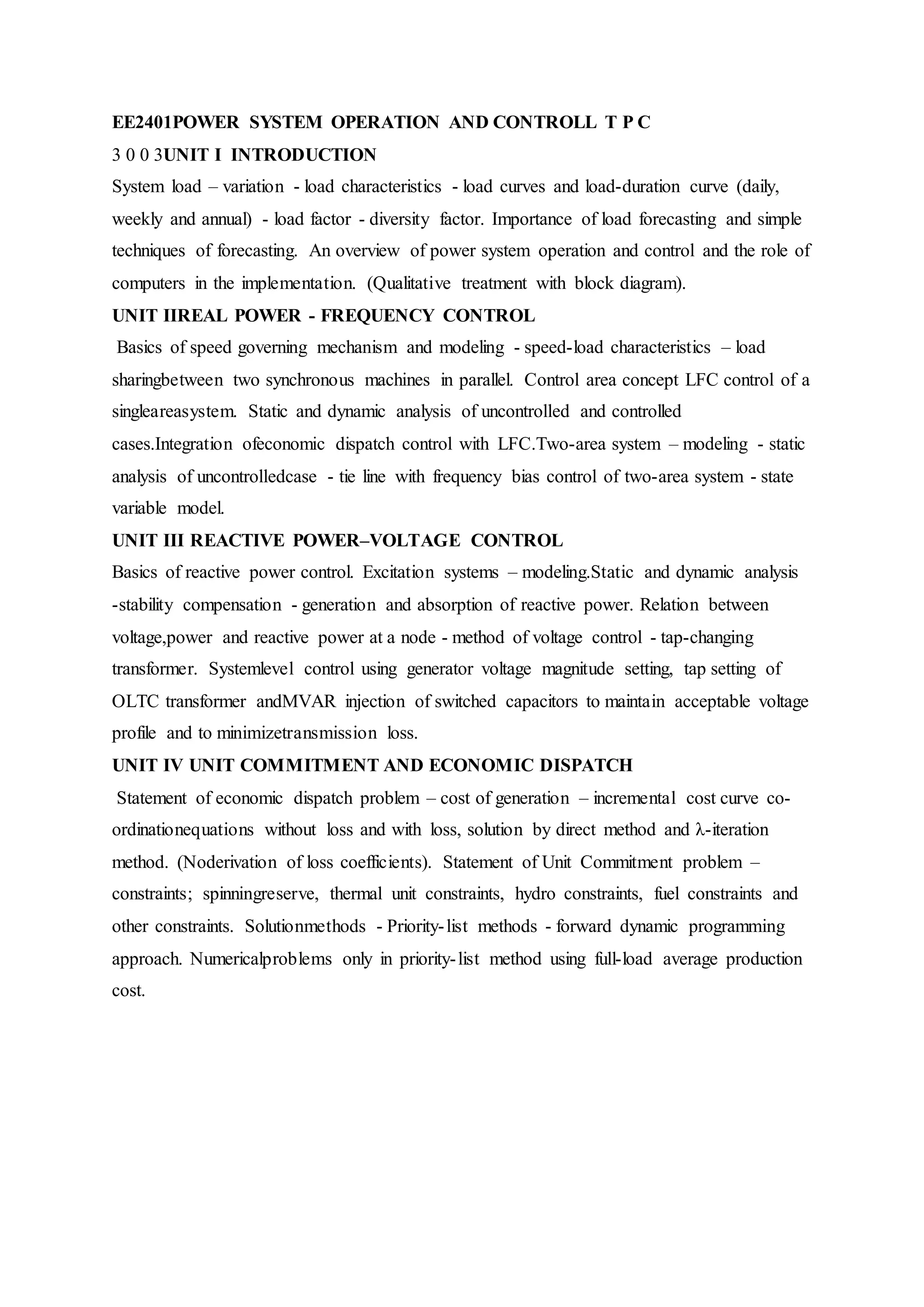 This document provides an overview of 5 course units related to power system operation and control: