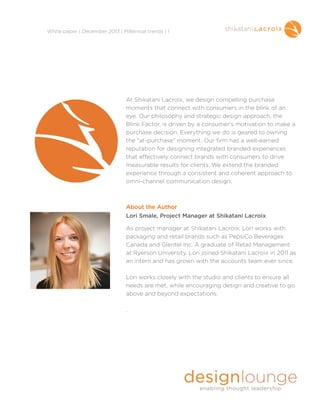 The white paper discusses millennial trends focusing on self-expression, new media, the share economy, and socially conscious consumerism. It highlights the significant impact of platforms like Instagram, Snapchat, and Netflix on how millennials engage with media and products, as well as the rise of crowdfunding sites such as Kickstarter and Airbnb. Additionally, it emphasizes the importance of corporate social responsibility, showcasing brands like TOMS and Warby Parker that incorporate giving back into their business models.
