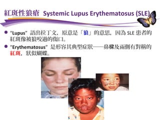紅斑性狼瘡 Systemic LupusErythematosus (SLE) “Lupus” 語出拉丁文,原意是「狼」的意思,因為 SLE 患者的 紅斑像被狼咬過的傷口。 “Erythematosus” 是形容其典型症狀──鼻 及兩側有對稱的樑 紅斑,狀似蝴蝶。