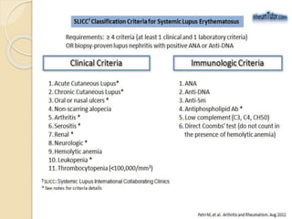 This document describes a case of systemic lupus erythematosus (SLE) in a 30-year-old female patient presenting with fever, joint pain, and rash. On examination, the patient showed malar rash, joint swelling, and limitation of movement. Tests found anemia, renal dysfunction, positive ANA and dsDNA antibodies. A renal biopsy was consistent with lupus nephritis. Based on the characteristic rash, joint and renal involvement, positive serology, and biopsy results, the patient was diagnosed with SLE. The document then provides background information on SLE, including causes, clinical manifestations, diagnostic evaluation and criteria, management, and pathology findings.