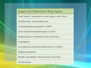 This document defines and describes sleep apnea, its types (obstructive, central, mixed), risk factors, symptoms, complications, diagnosis via polysomnography (PSG), and treatment options including weight loss, CPAP, oral devices, surgery, and management of obesity hypoventilation syndrome. Sleep apnea is characterized by pauses in breathing during sleep caused by airway collapse and is associated with daytime sleepiness and cardiovascular issues. PSG is the gold standard test to evaluate sleep architecture and breathing disturbances. Treatment focuses on maintaining an open airway through lifestyle changes and devices.